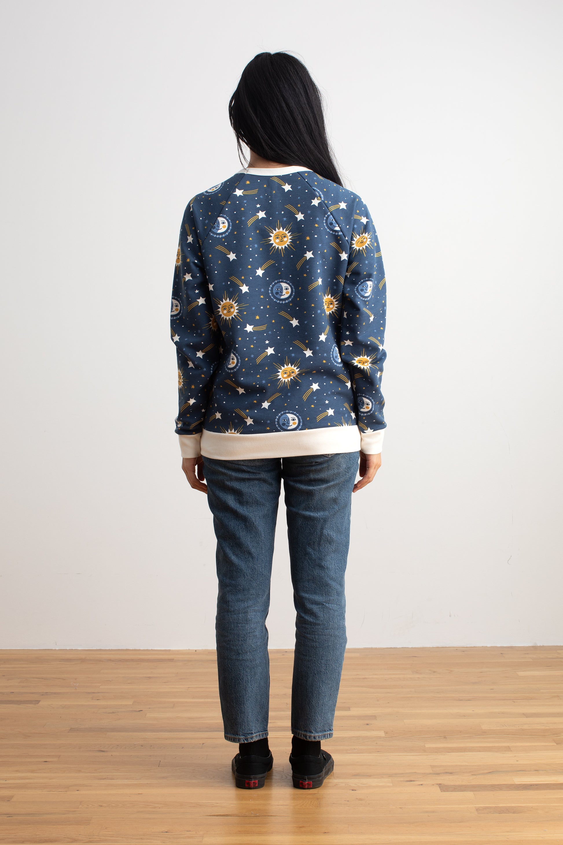 Our comfy adult sweatshirt in our Celestial print, featuring smiling suns, moons, and shooting stars scattered across a magical night sky.