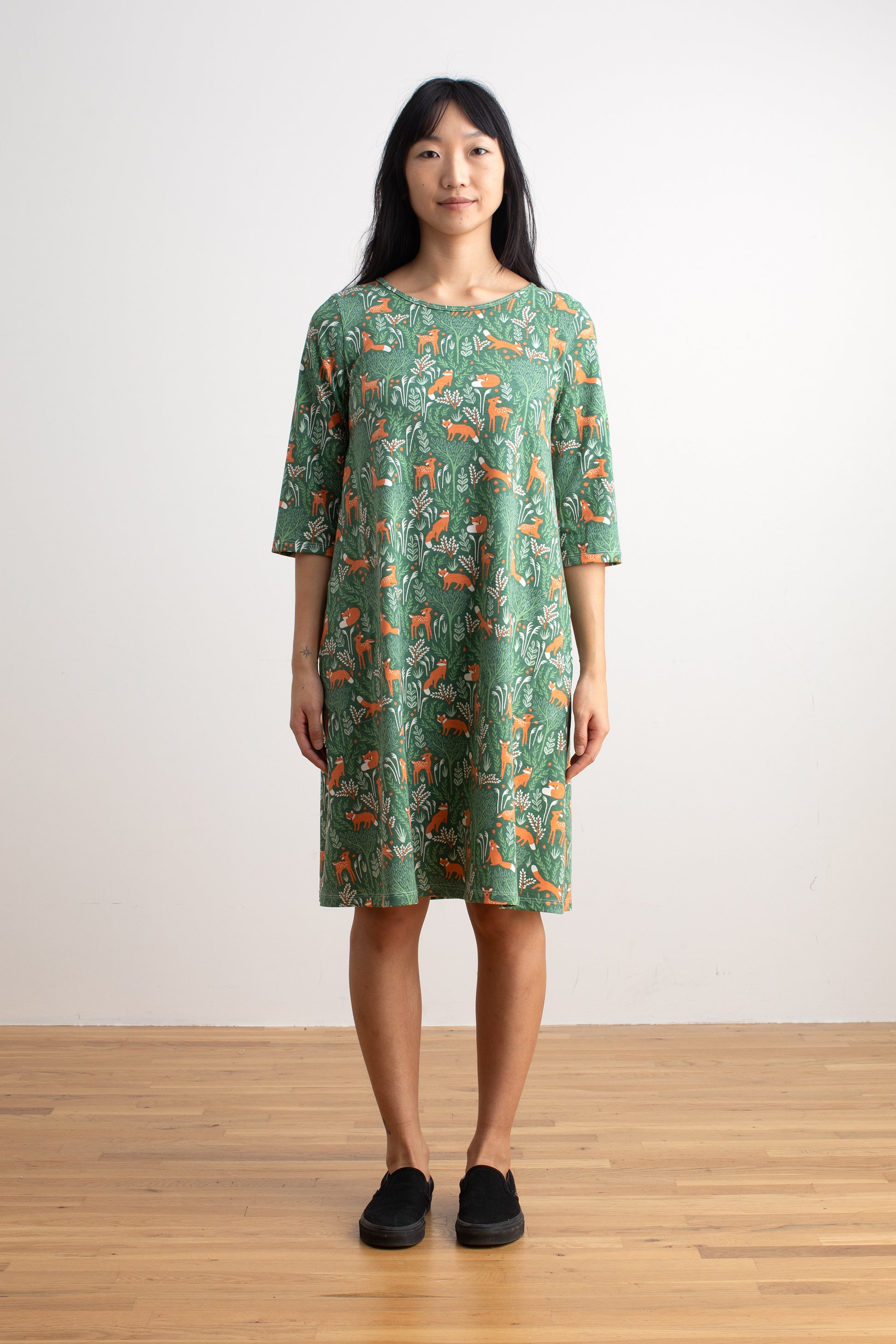 A wardrobe staple in our Deer & Foxes print. Curious forest friends explore lush woodlands.