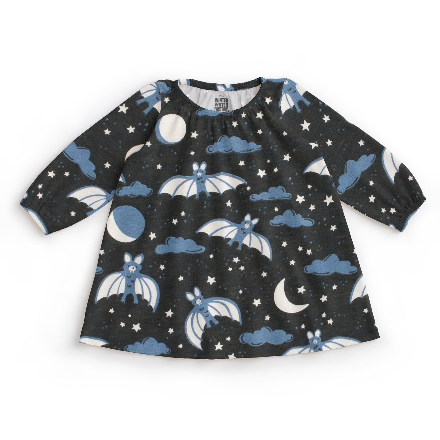 The prettiest of baby dresses in our Bats print, featuring our nocturnal friends exploring the night sky.