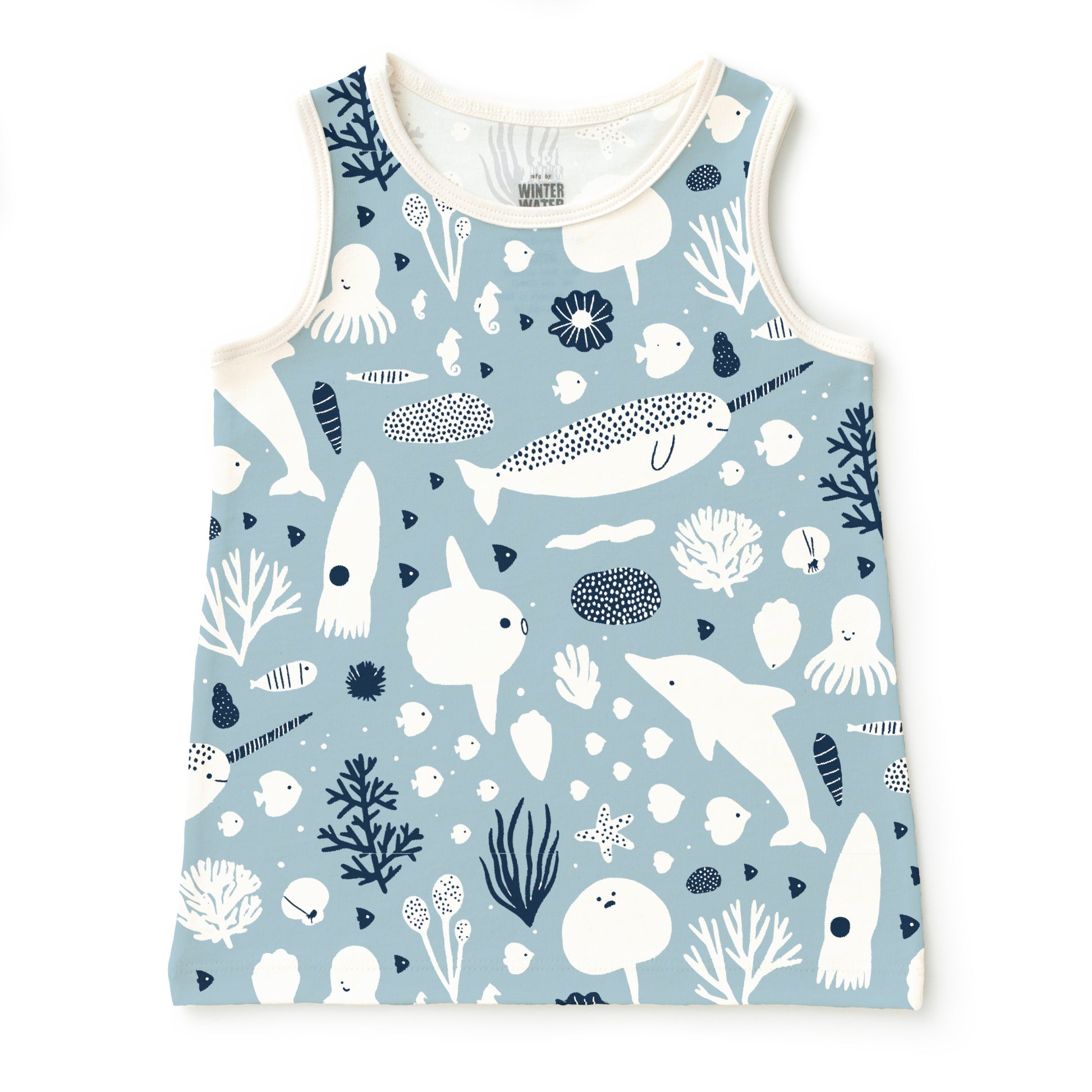 A light and breezy tank for your littlest ones, in our Sea Creatures print! Can you spot the narwhal?