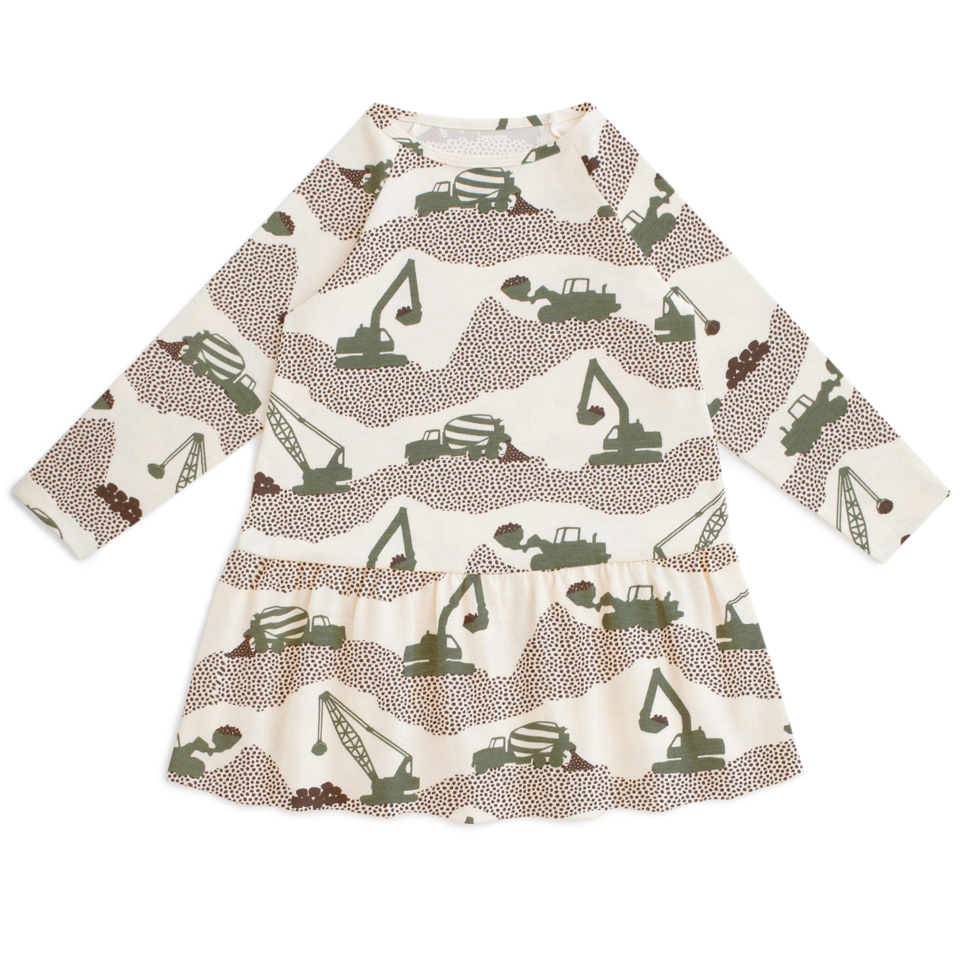 The best dress for twirling, in our Construction print! A construction site bustles as bulldozers, cranes, cement mixers, and excavators work hard to get the job done! A beloved classic now available in a limited-edition new colorway.