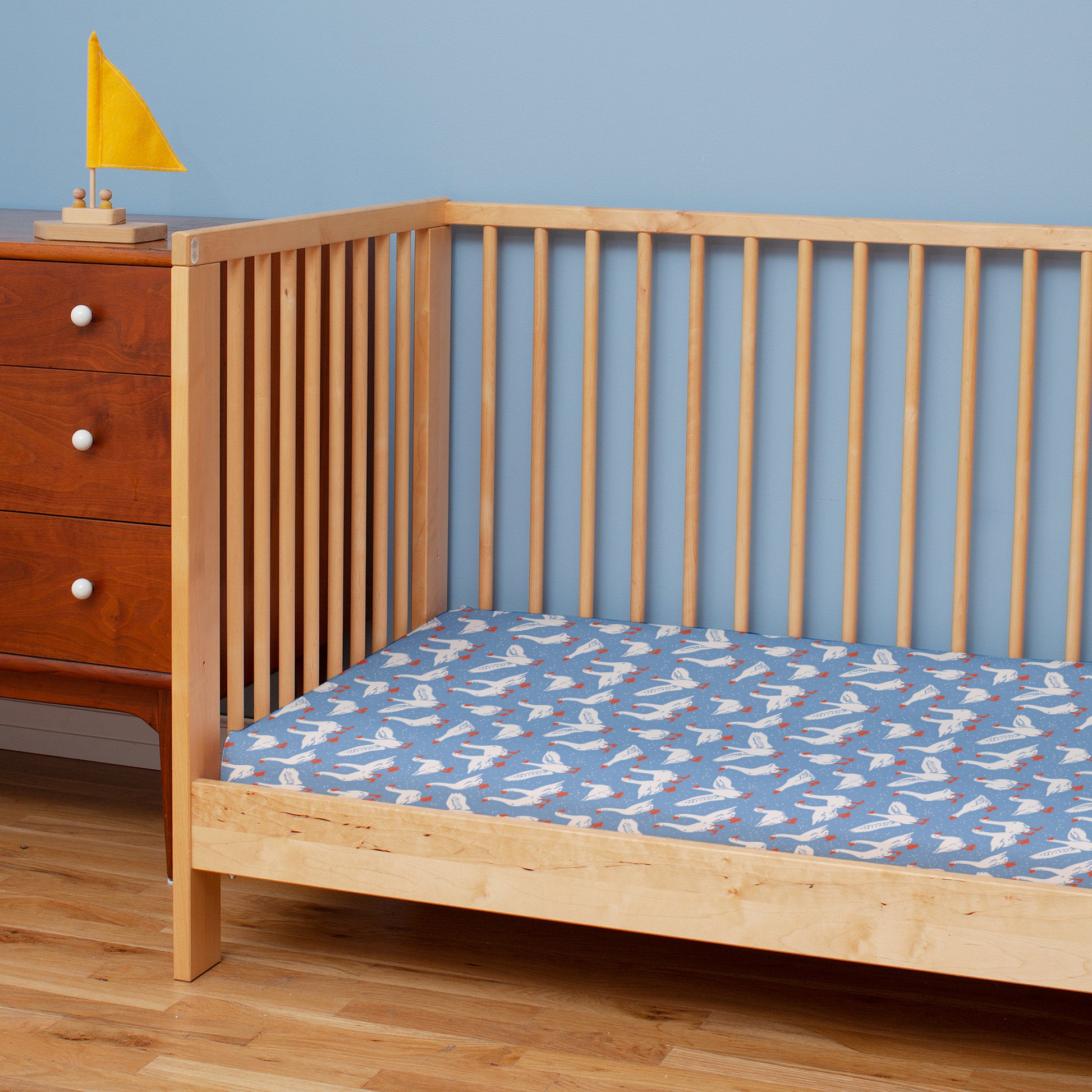 Our classic baby and toddler fitted sheets in our Silly Geese print. A flock of silly geese on a peaceful powder-blue background. Honk!
