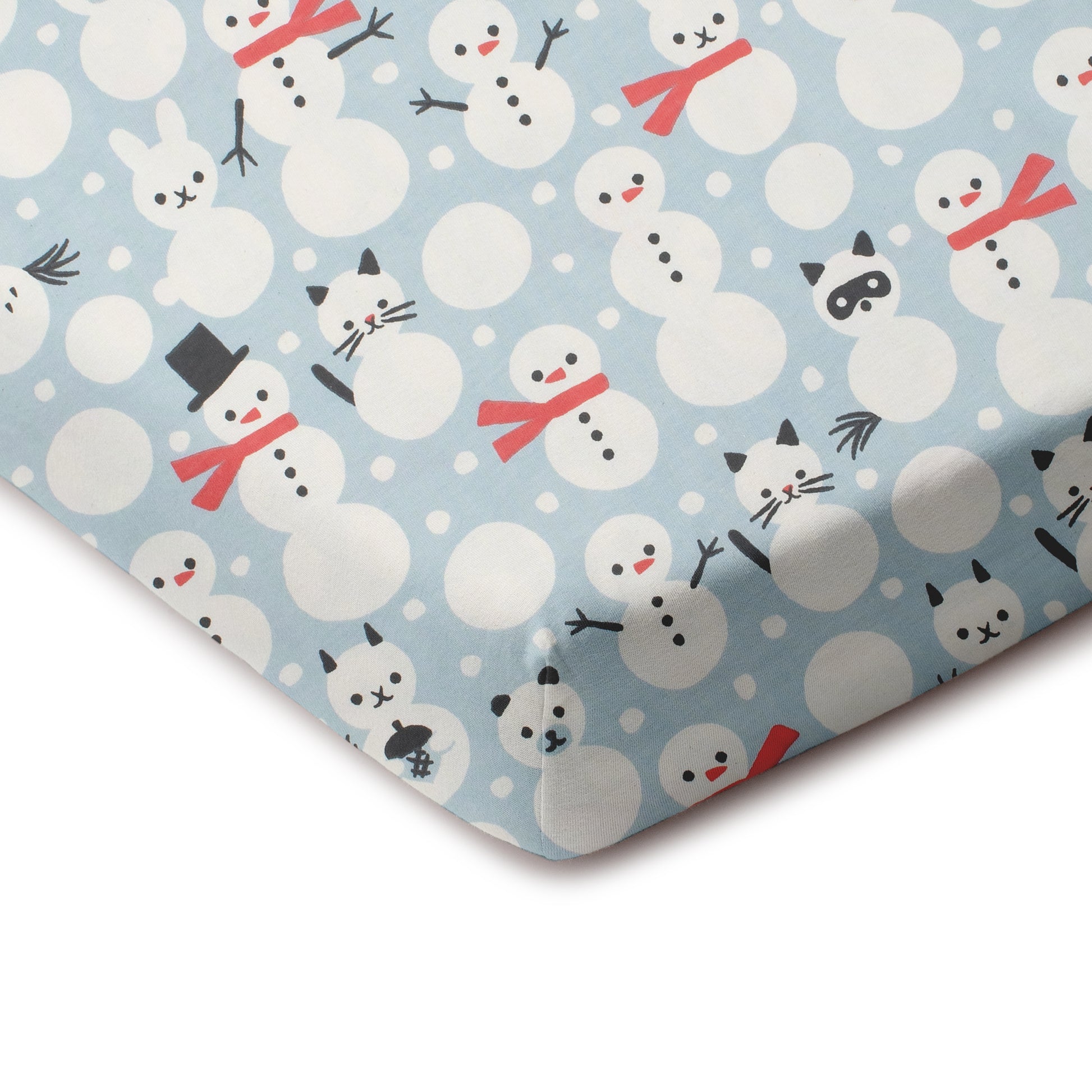 Our classic baby and toddler fitted sheets in our Snow Creatures print, featuring a flurry of snow folk--and snow-animals--bundled up and ready to play!