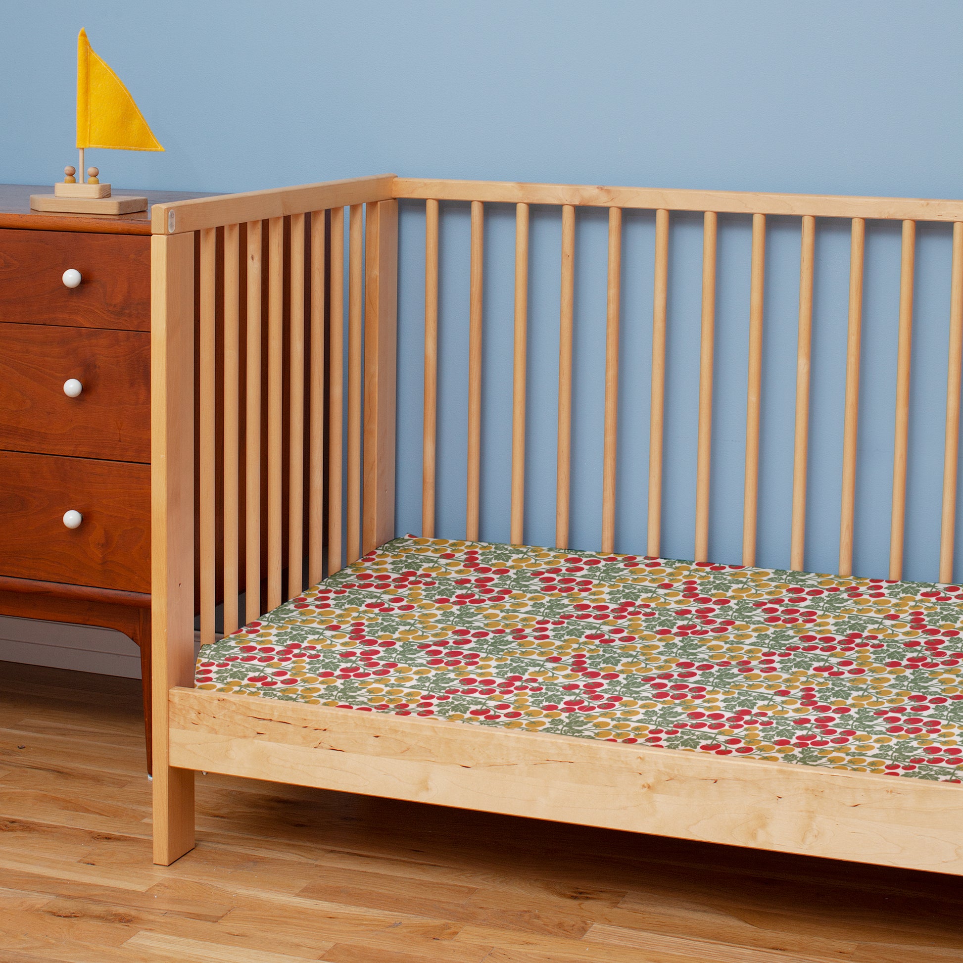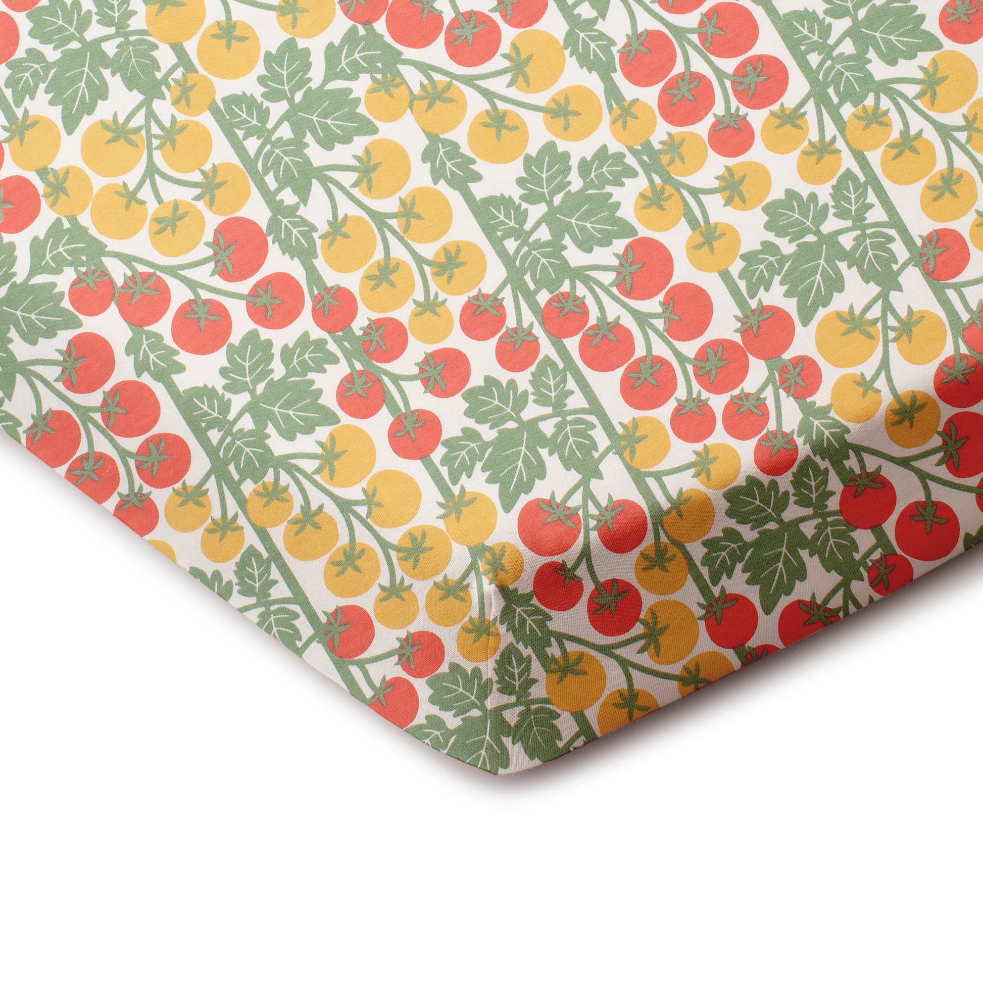 Our classic baby and toddler fitted sheets in our Tomato Vines print. Ripe, juicy tomatoes in bright pops of red and yellow, ready to be plucked.