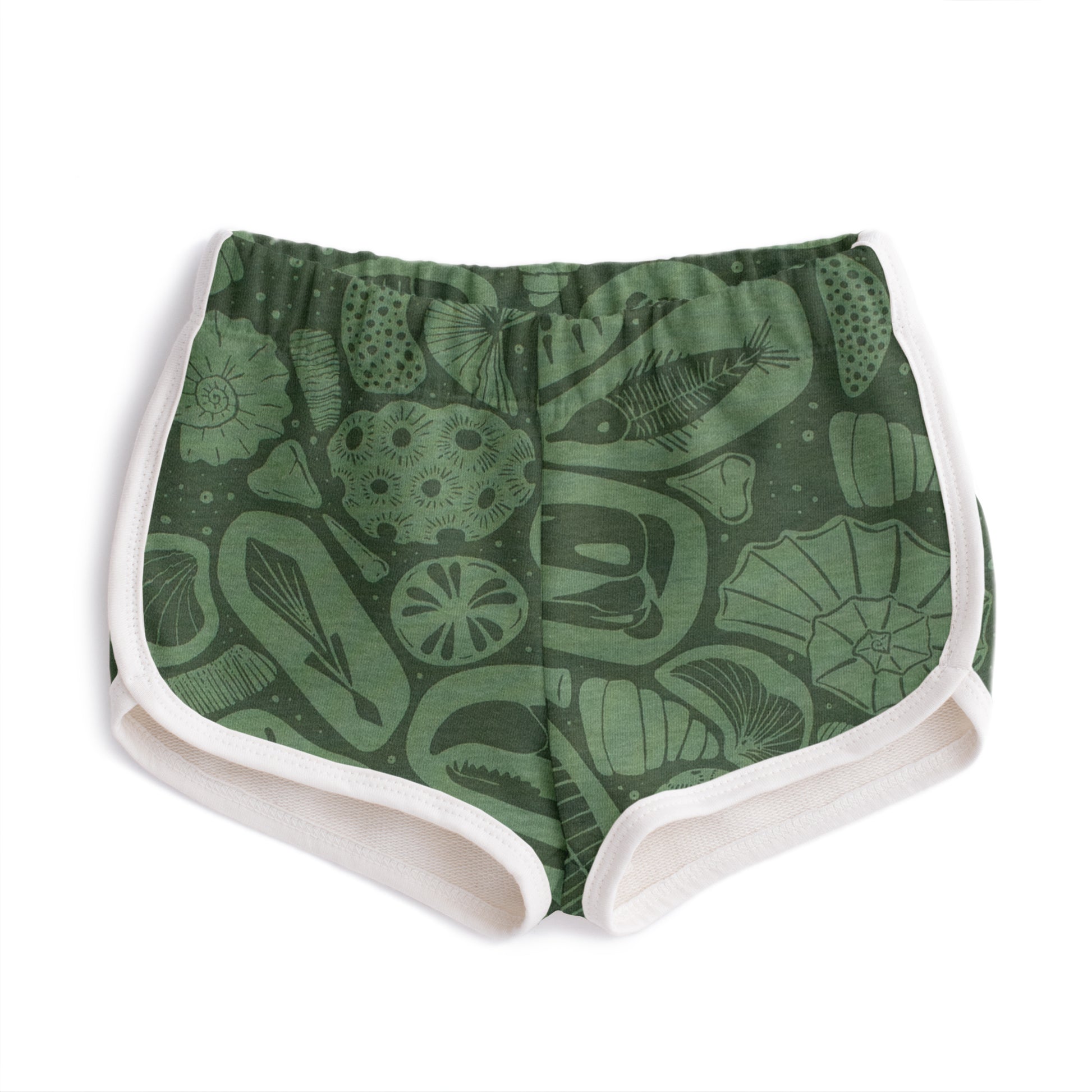 Our french terry shorts in our Fossils print. Budding paleontologists will dig studying these intriguing specimens and prehistoric relics.