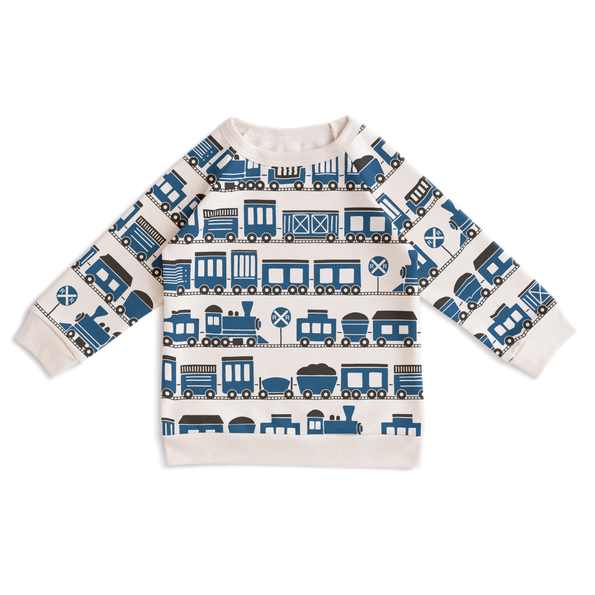 A super-soft sweatshirt, in our Trains print - choo choo trains whistling off on their tracks, traveling to distant lands.