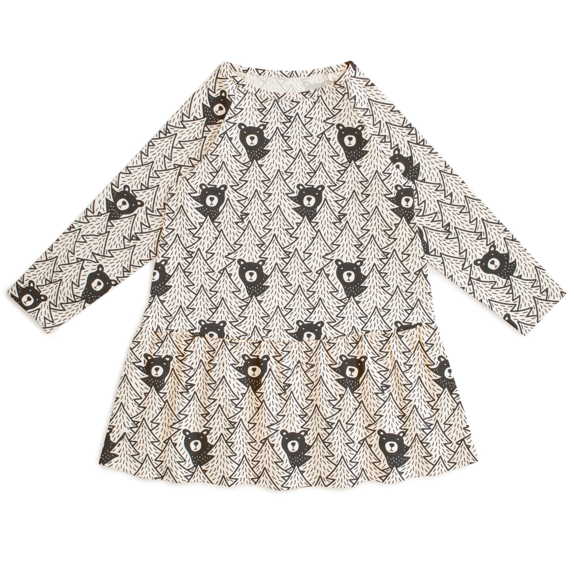 The best dress for twirling, in our Bears print! Which features a curious bunch of bears peeking out from behind the pine trees.
