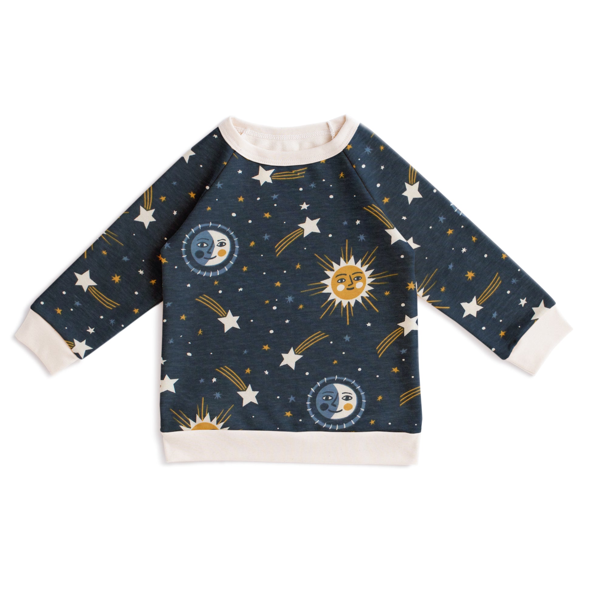 A super-soft sweatshirt, in our Celestial print, featuring smiling suns, moons, and shooting stars scattered across a magical night sky.