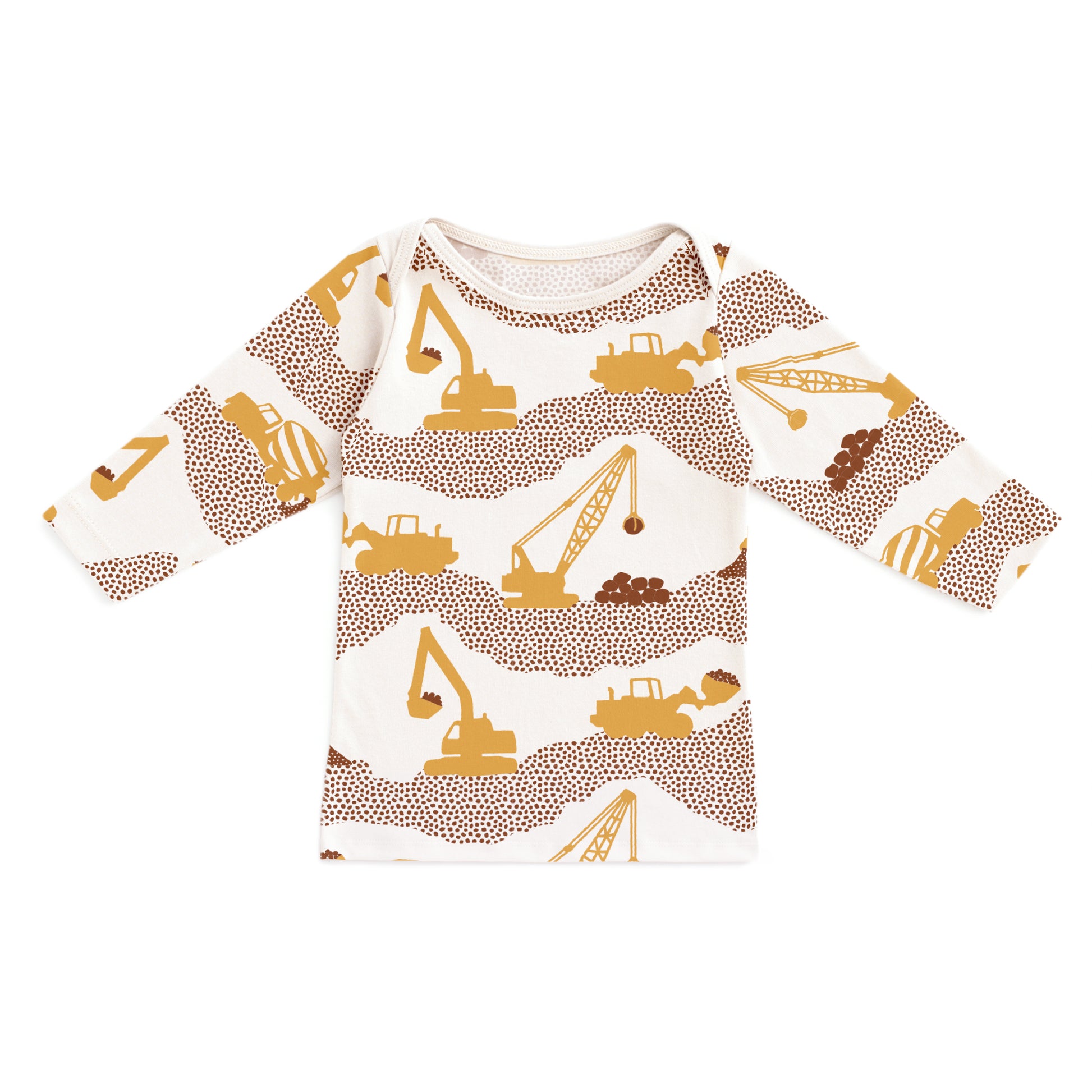 The cutest little lap tee, in our Construction print! A construction site bustles as bulldozers, cranes, cement mixers and excavators work hard to get the job done!