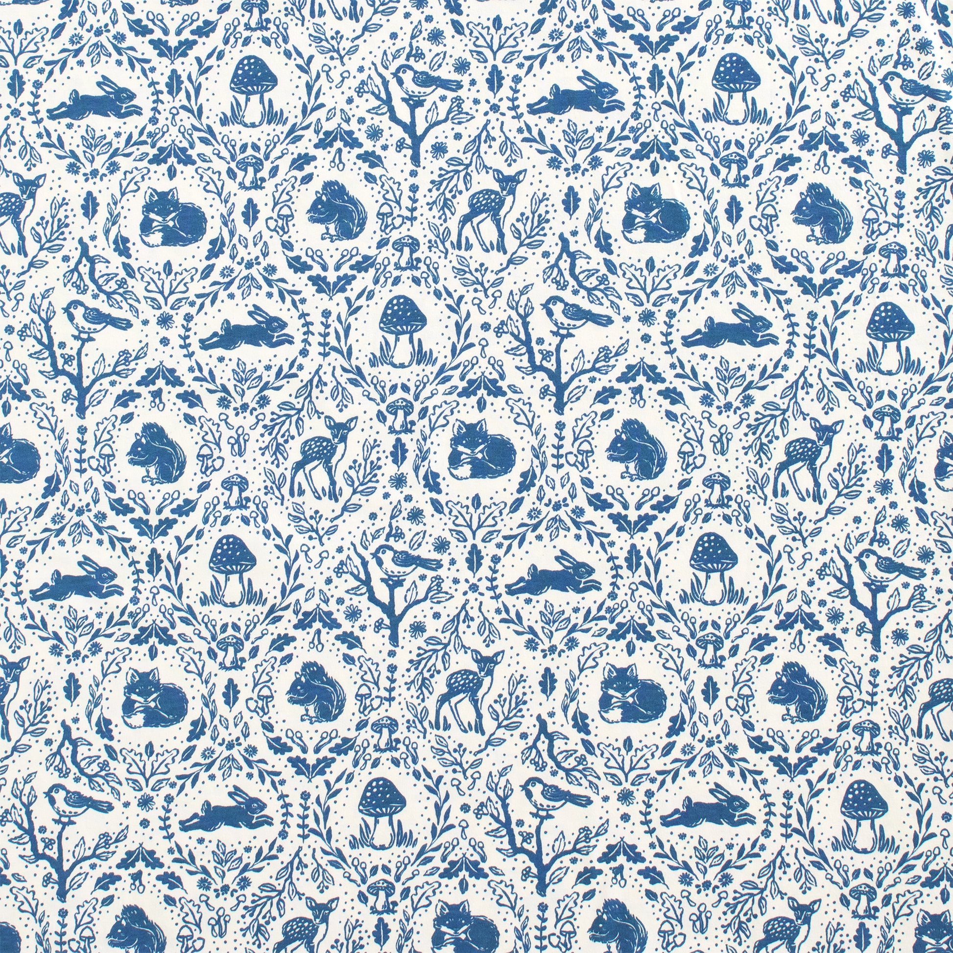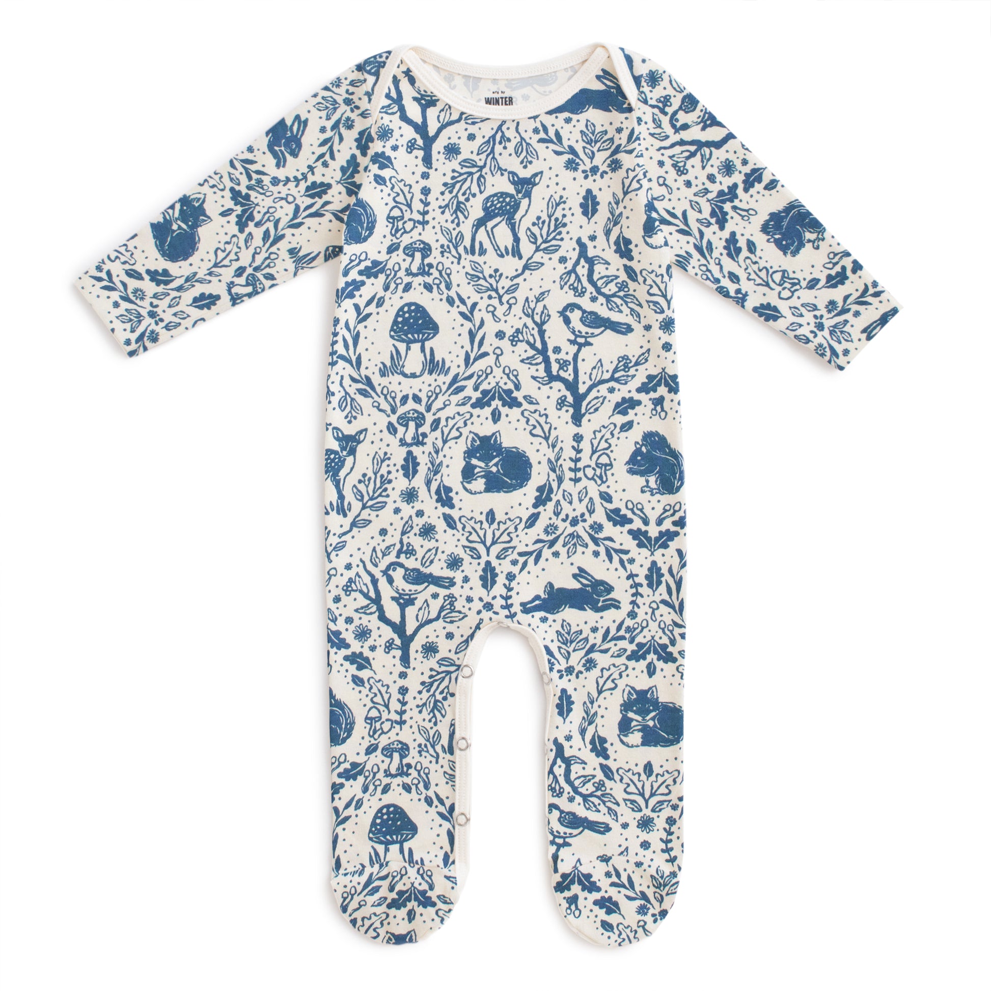 The most cuddly footed romper in our Animal Tapestry print. Foxes, deer, birds, and other woodland friends nestled among mushrooms and leaves.