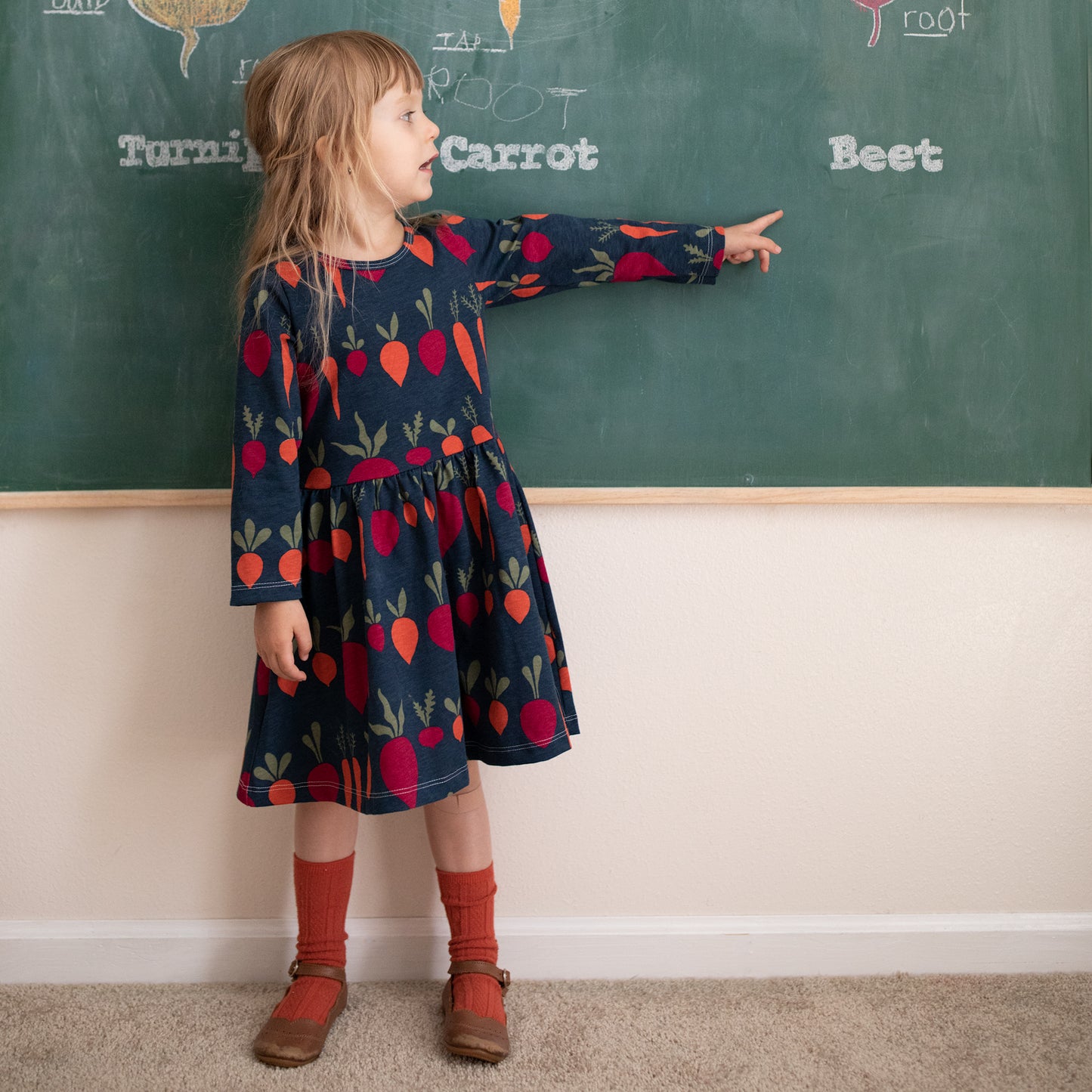 Our most versatile dress in our Root Vegetables print. Carrots, beets and perhaps even a rutabaga grow in the ground, waiting to be harvested and made in to delicious wintery meals.
