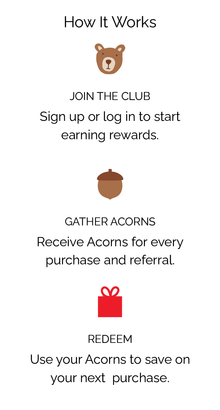 It’s our loyalty program—and your invitation to earn rewards for supporting Winter Water Factory. Members collect Acorns (our version of points) by shopping, referring friends, and joining in on the fun. Then, redeem those Acorns for discounts at checkout.