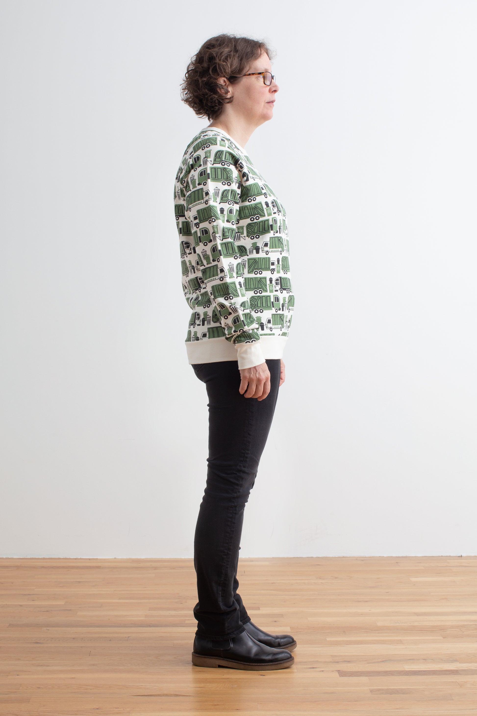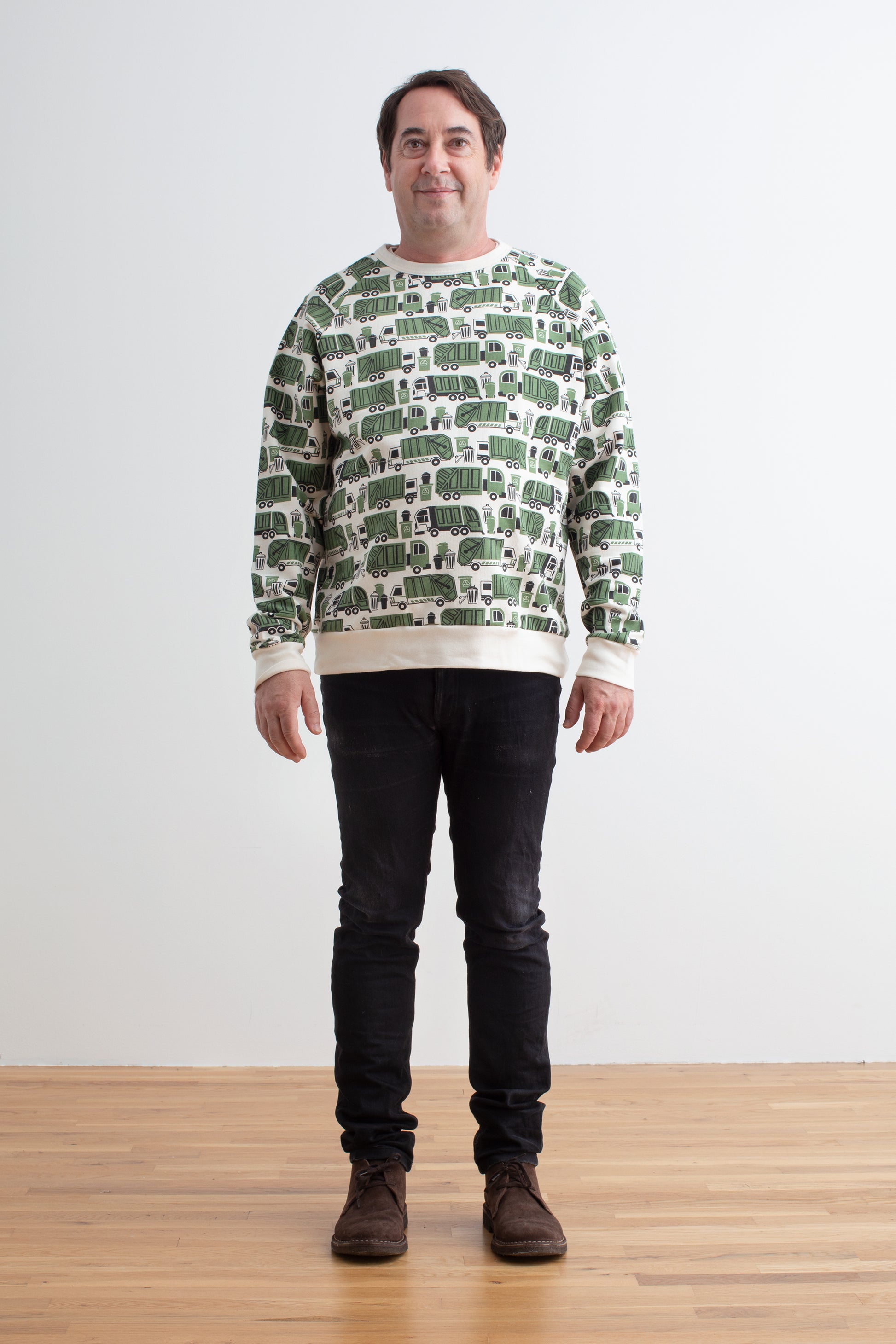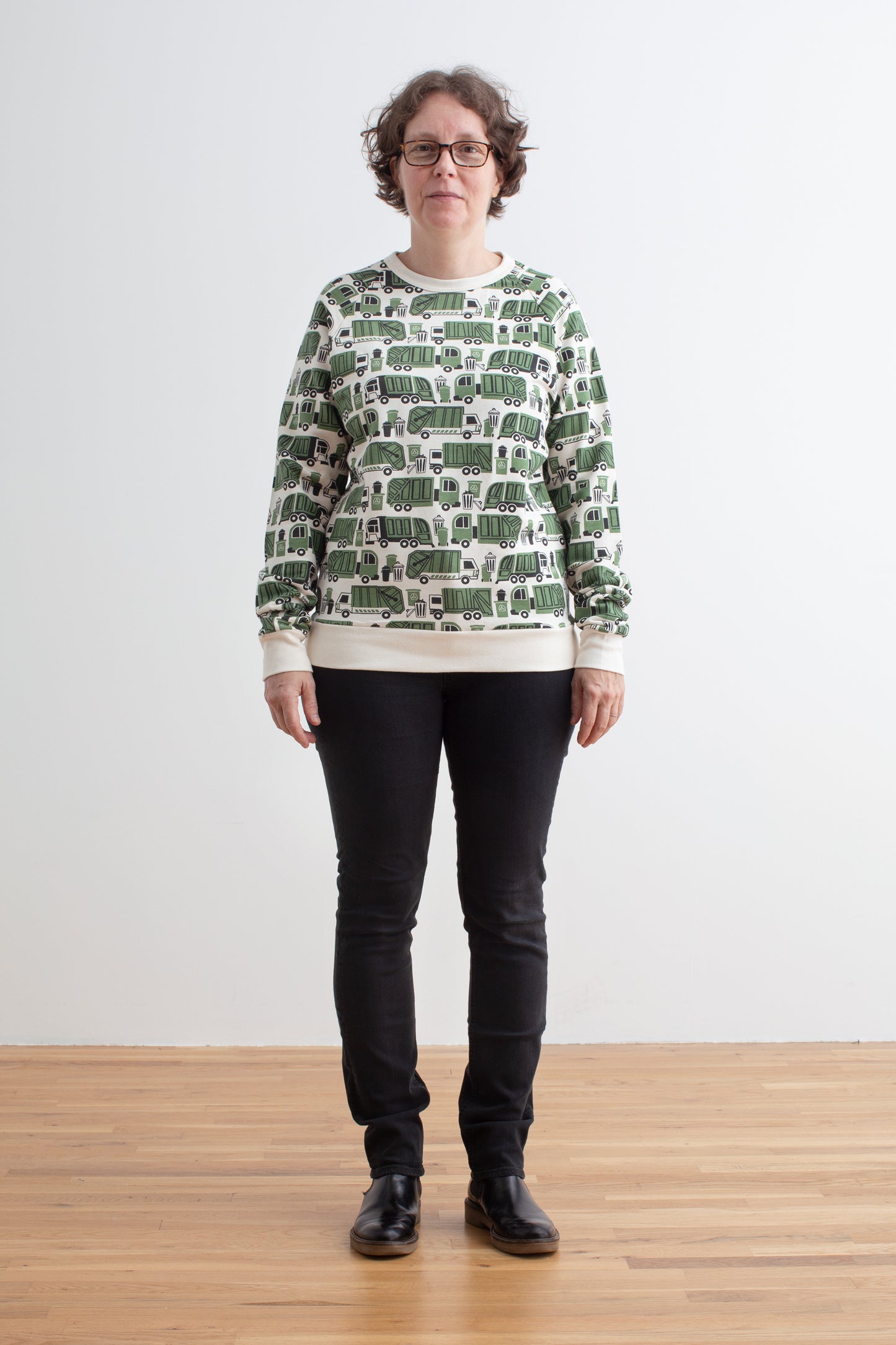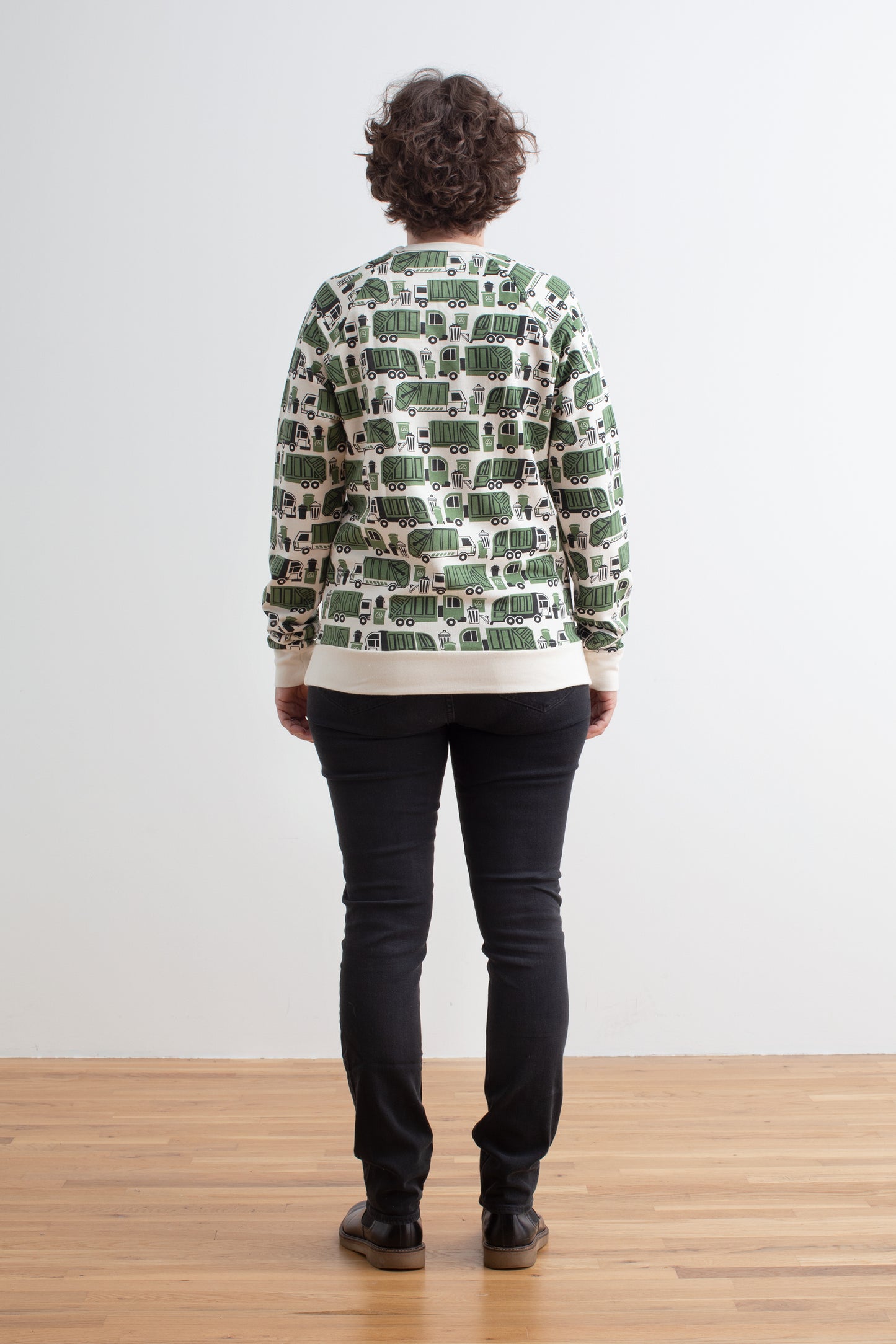 Our comfy adult sweatshirt, in our Garbage & Recycling print. Here come the trucks! Make sure you get all your recyclables and trash out to the curb in time!