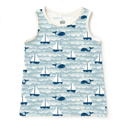 A light and breezy tank for your littlest ones, in our Sailboats print. Ahoy there! Sail the open seas alongside some friendly whales.