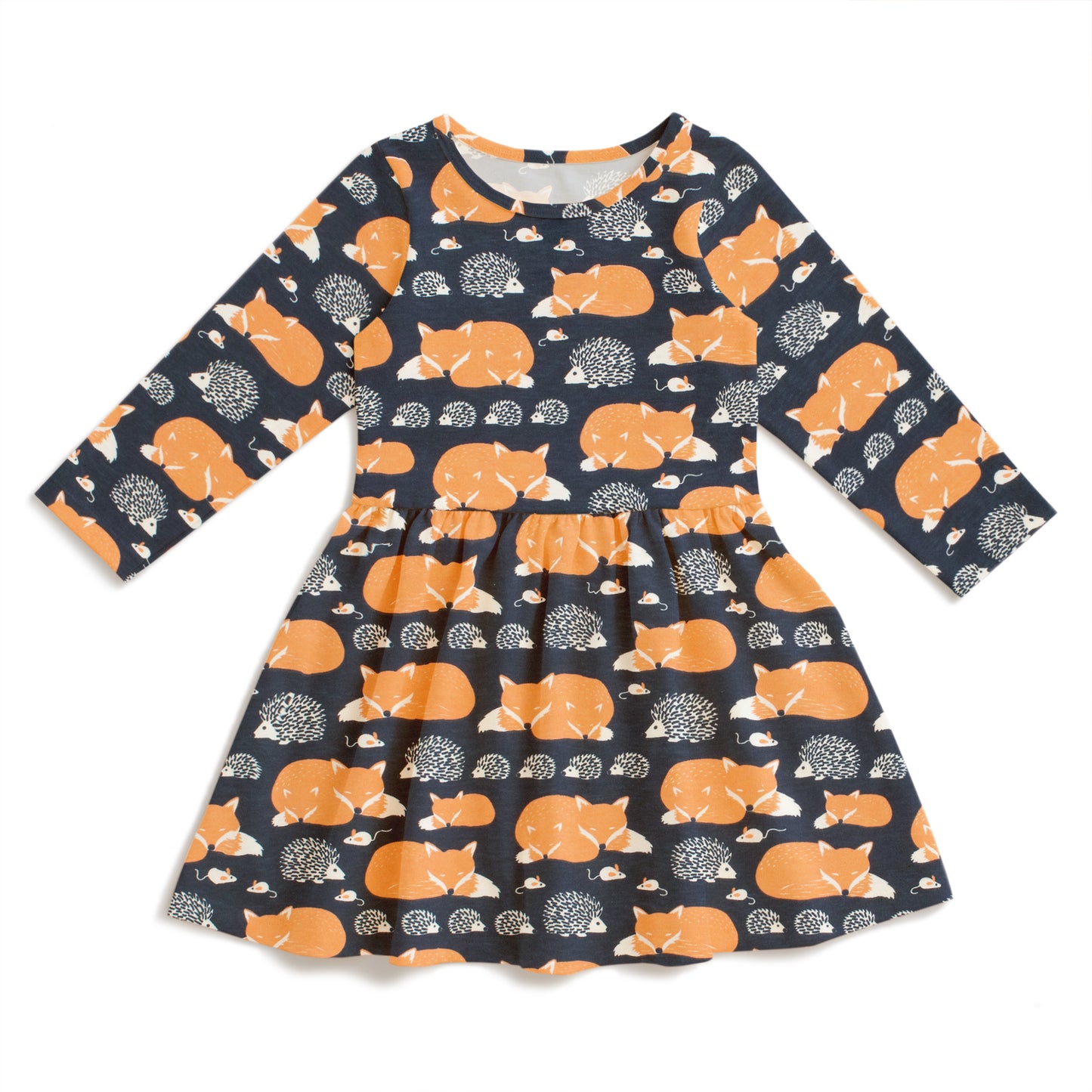 Our most versatile dress, in our Foxes and Hedgehogs print. A cozy forest scene with snuggly foxes, a hedgehog family and a little mouse or two.