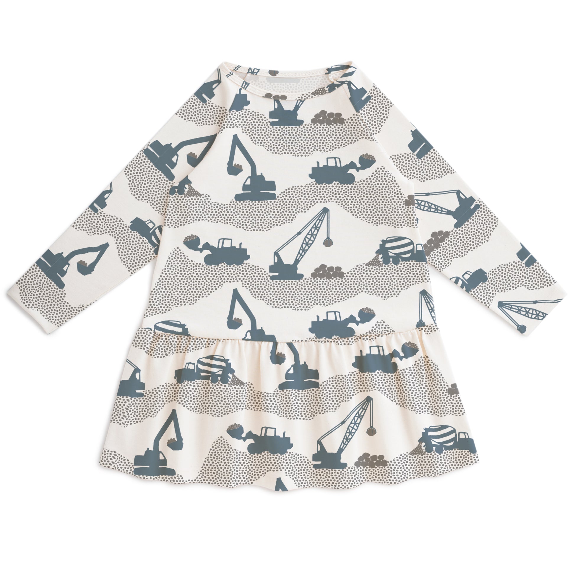 The best dress for twirling, in our Construction print! A construction site bustles as bulldozers, cranes, cement mixers and excavators work hard to get the job done!