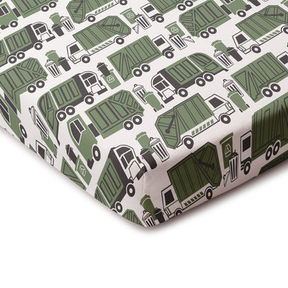 Our classic baby and toddler fitted sheets in our Garbage & Recycling print. Here come the trucks! Make sure you get all your recyclables and trash out to the curb in time!