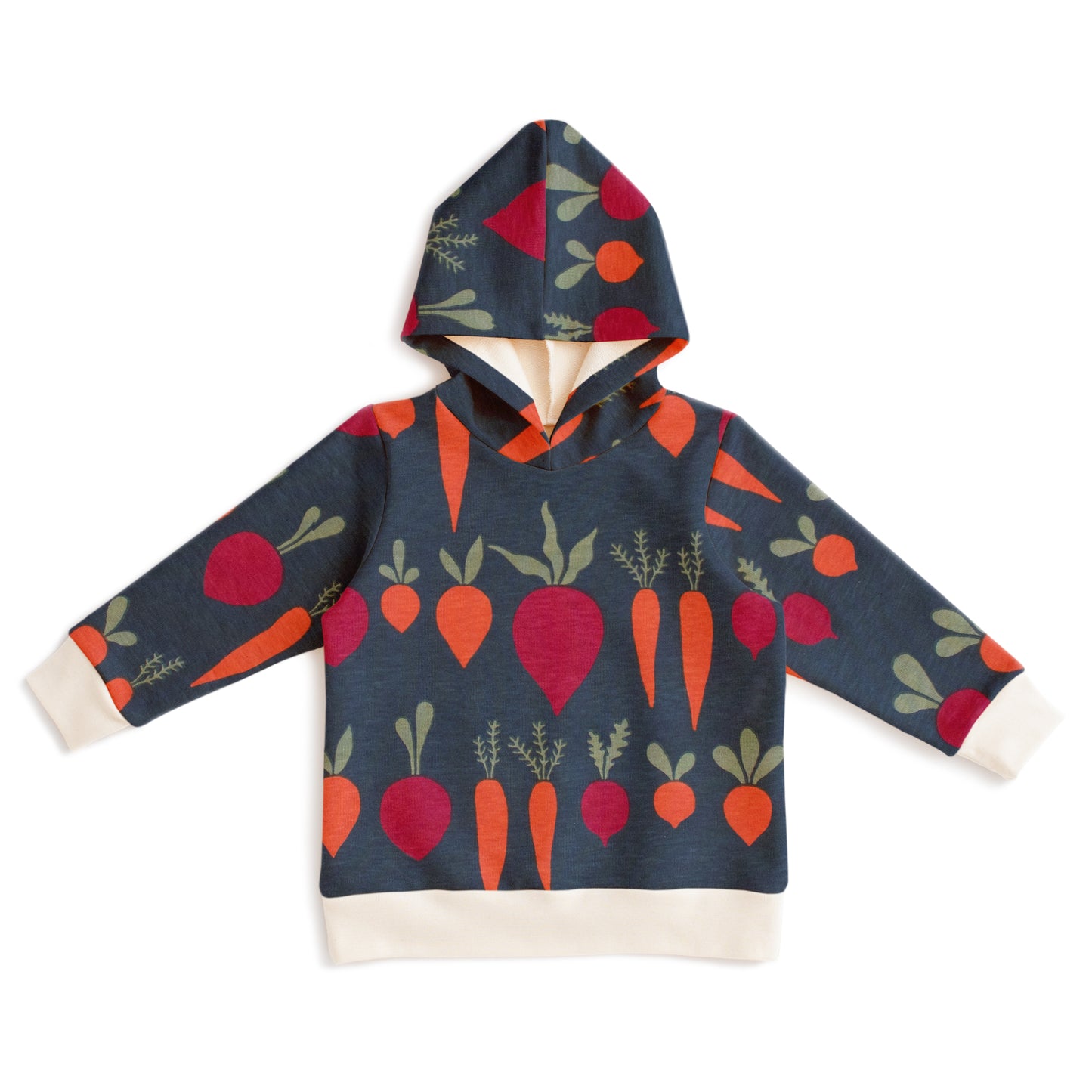 The perfect hoodie for layering, in our Root Vegetables print. Carrots, beets and perhaps even a rutabaga grow in the ground, waiting to be harvested and made in to delicious wintery meals.