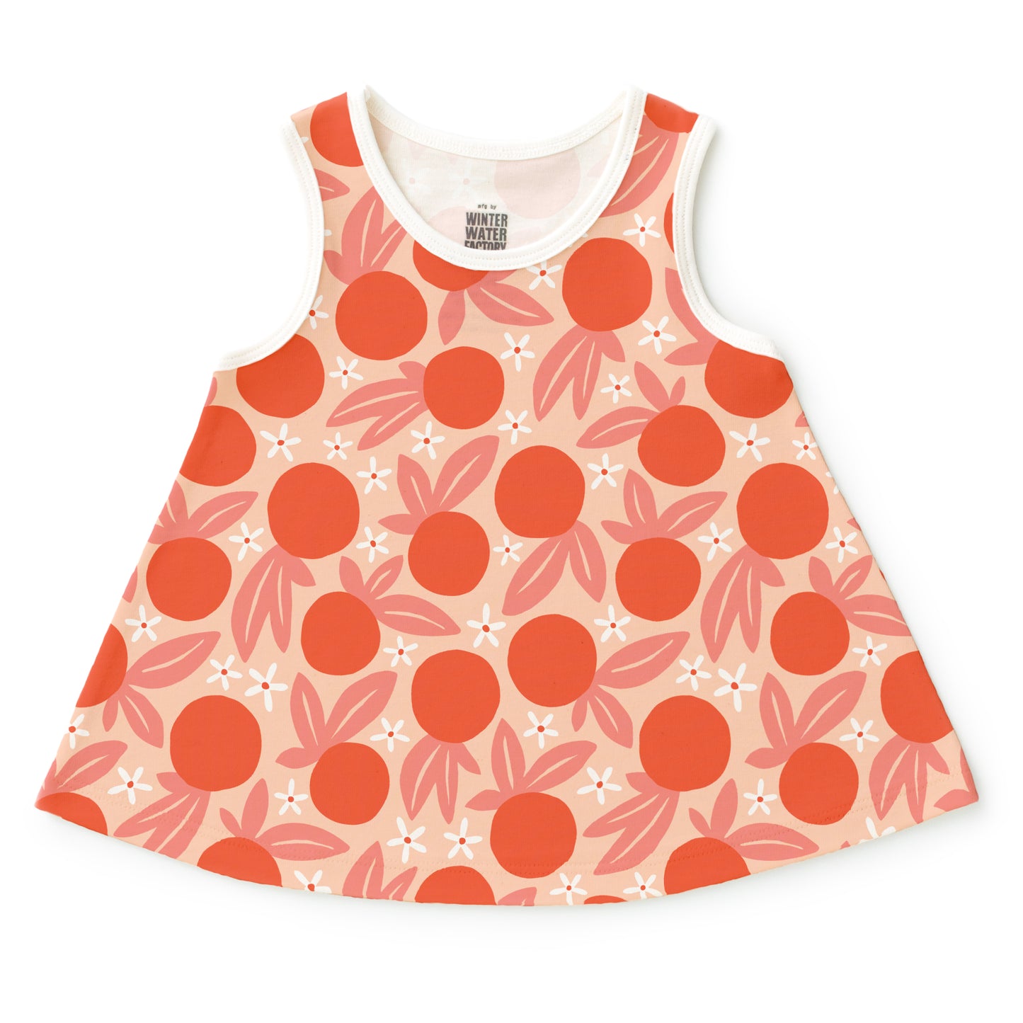 A summer baby tunic in our Clementines print, bright and sweet, these cheerful citrus fruits bring sunshine to the colder season.