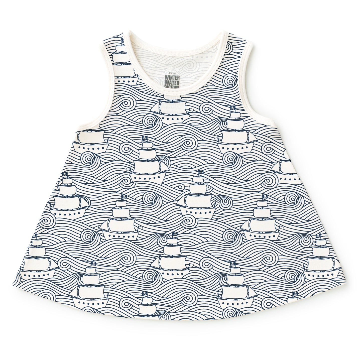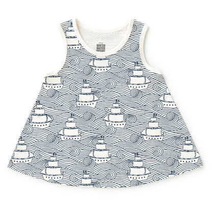 A summer baby tunic in High Seas, our most recognizable and loved print of all time! Pirate ships sail on delicate tempest seas.