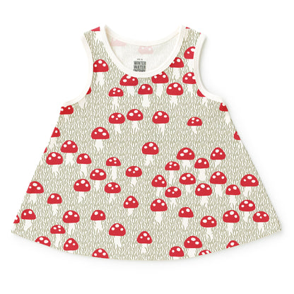 A summer baby tunic in our classic Mushrooms print featuring red speckled toadstools in a grassy meadow. For your favorite forager!