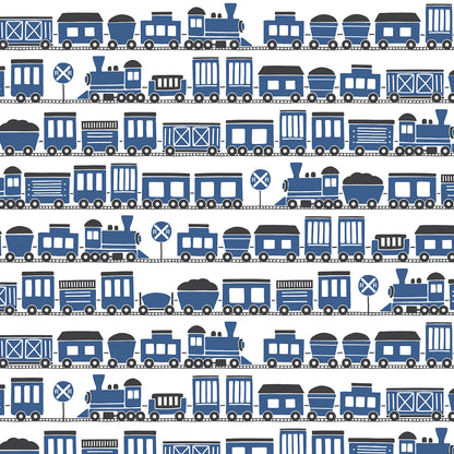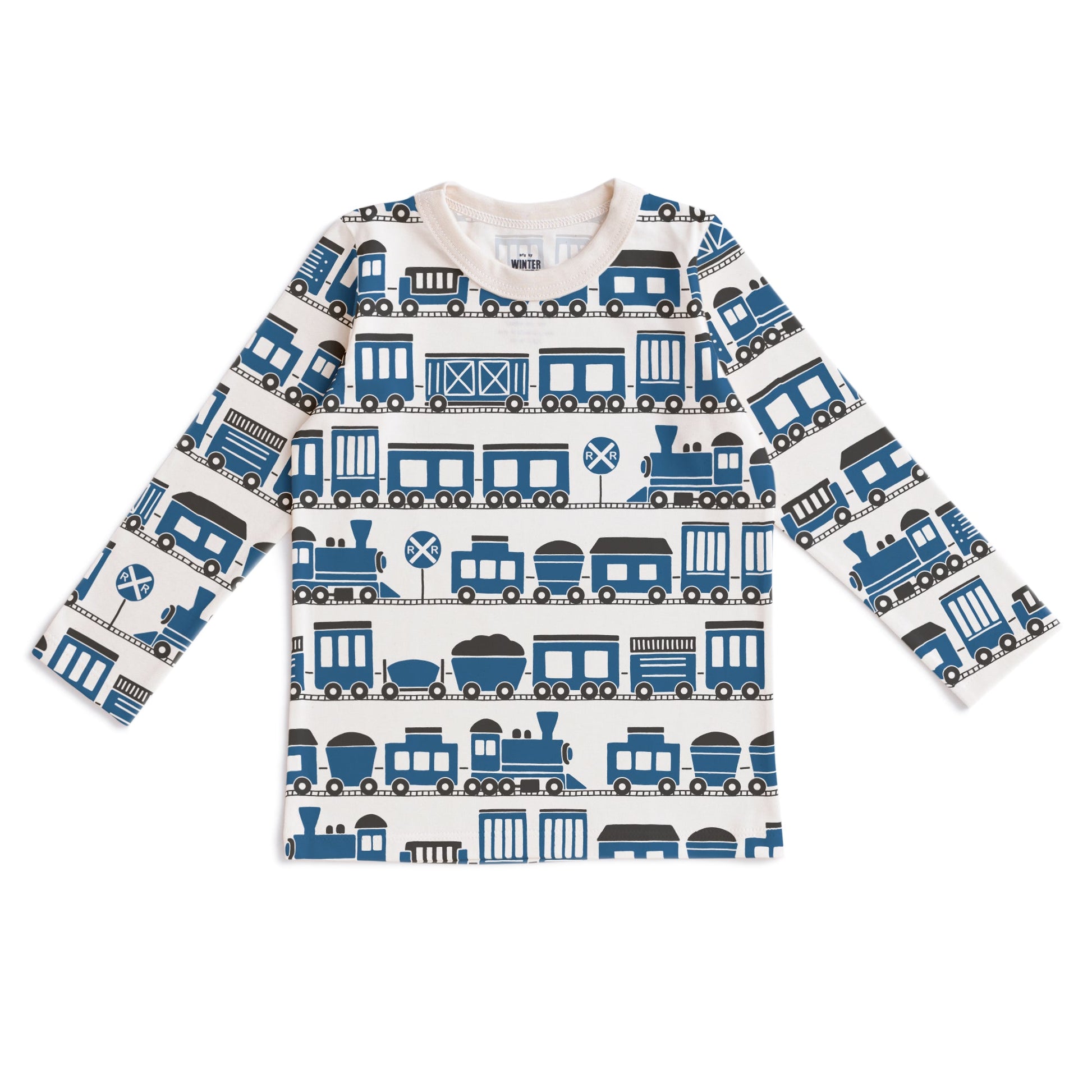 Our Trains long sleeve tee is made with organic cotton and ethically sewn in Brooklyn. With blue locomotives chugging across a natural base, this soft and comfy shirt is perfect for little train lovers with big imaginations. Great for layering or wearing on its own during everyday adventures.