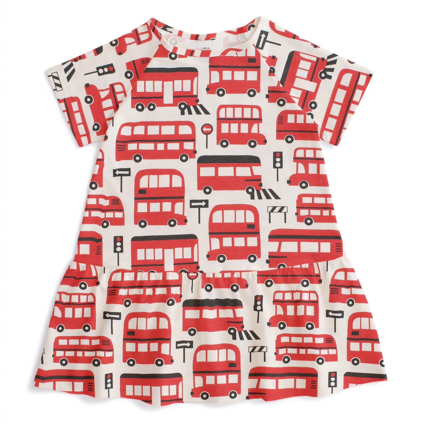 The most comfy, twirly dress of her dreams, in our Double-Decker Buses print featuring traffic filled with these tall vehicles.