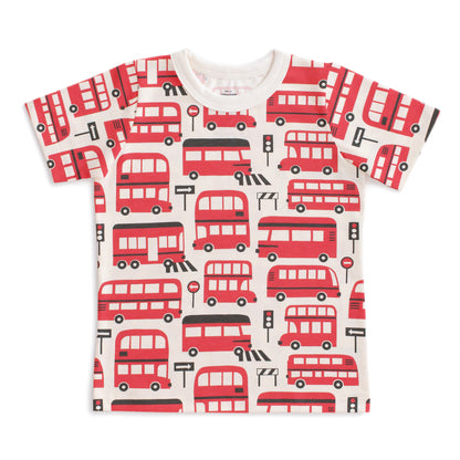 The perfect tee in our Double-Decker Buses print featuring traffic filled with these tall vehicles.