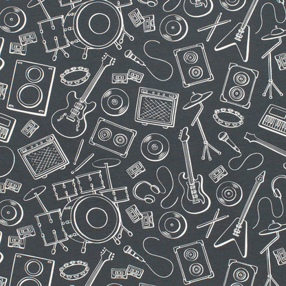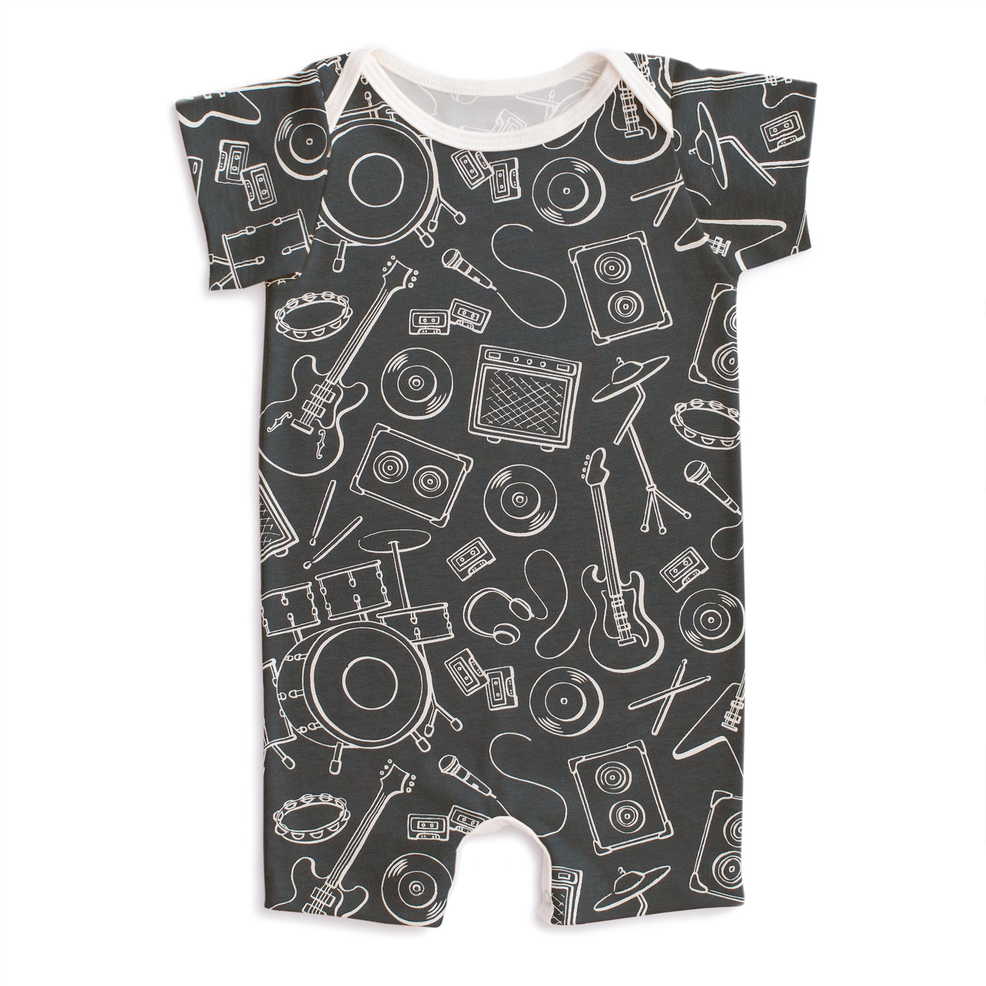 The one-piece outfit just perfect for play in our Rock Band print. Rock on!