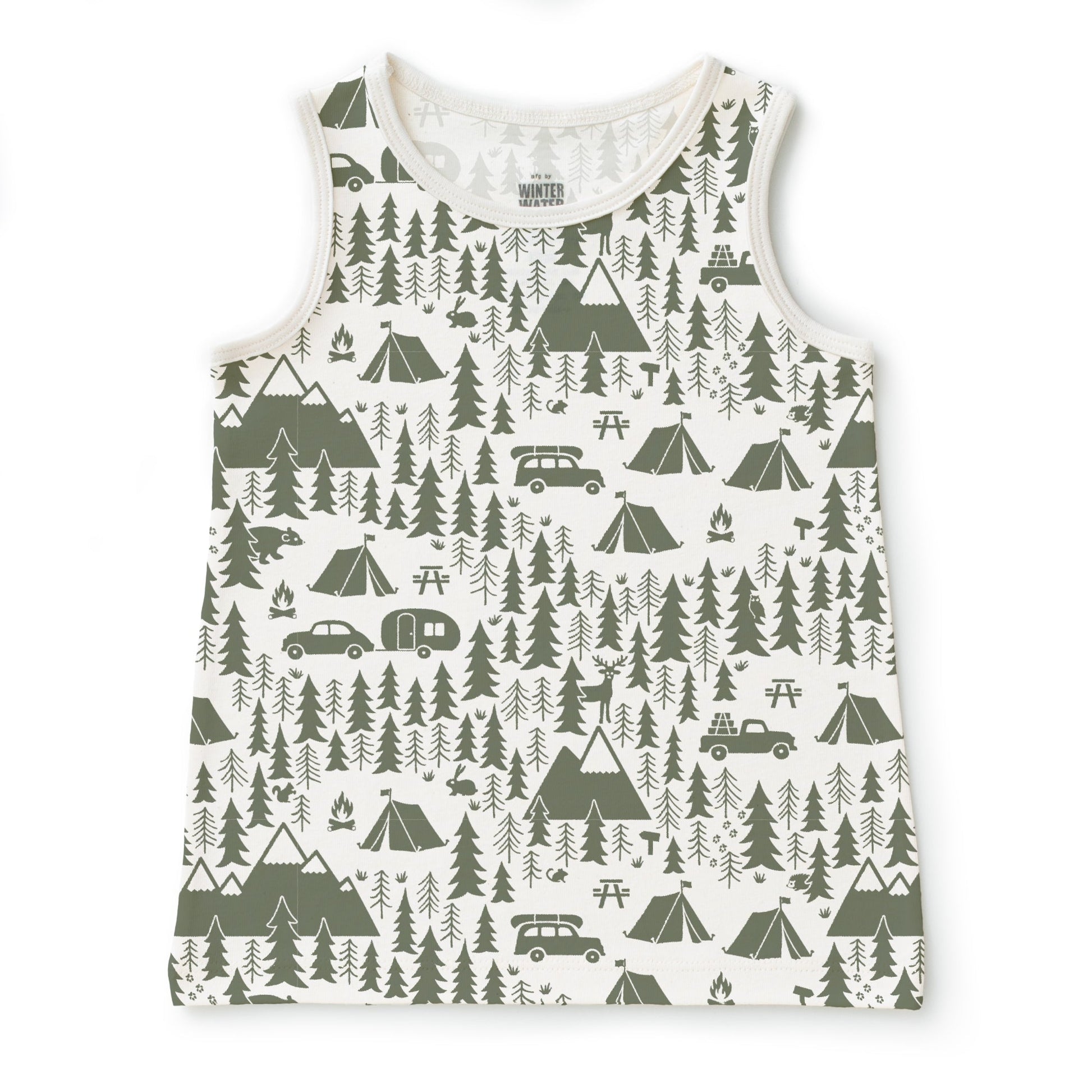 A light and breezy tank for your little ones, in our Campground print! Let's take a trip to the mountains. There's a curious bear, canoes, firepits, tents are more!