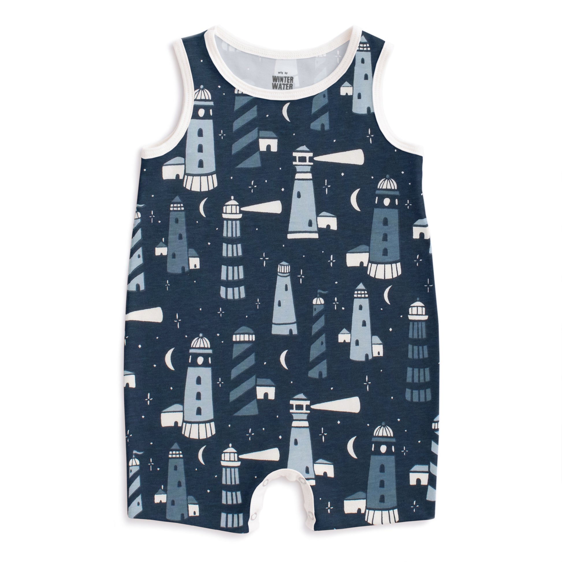 The perfect one-piece outfit in our Lighthouses print. Standing tall and brave on the shorelines, these beacons of light guide the way.